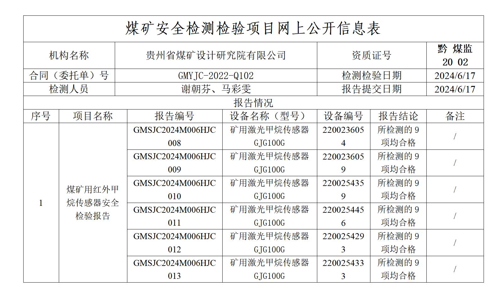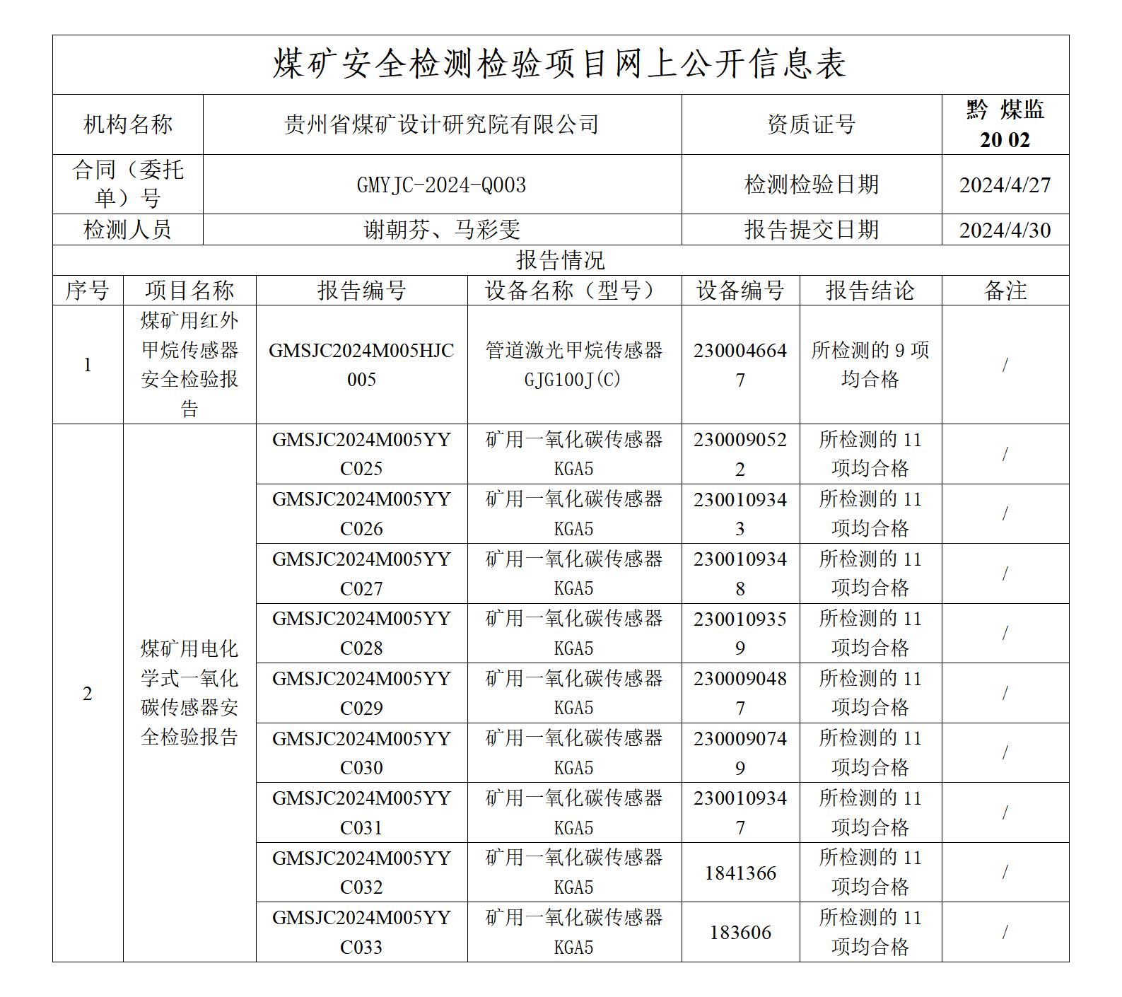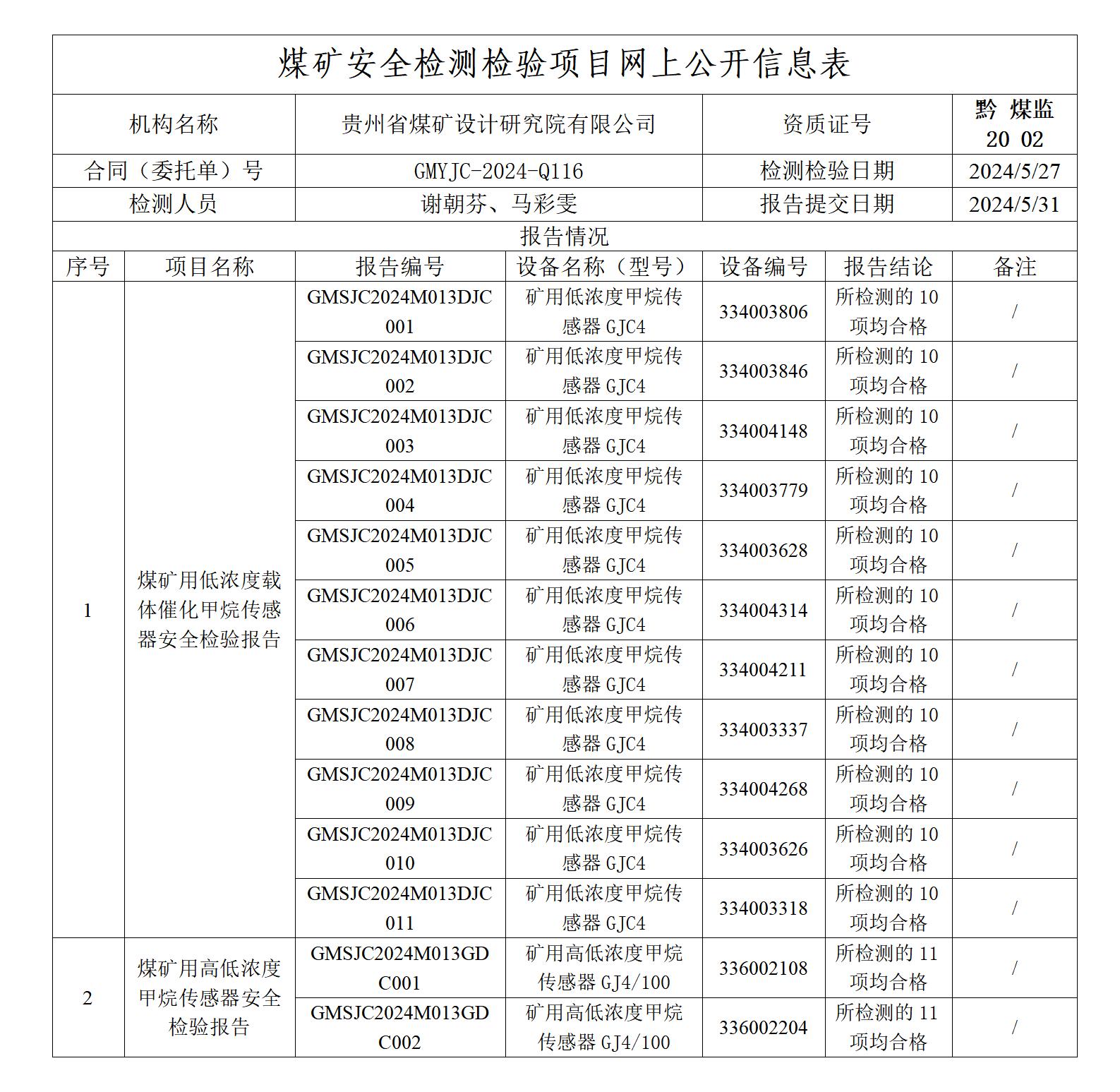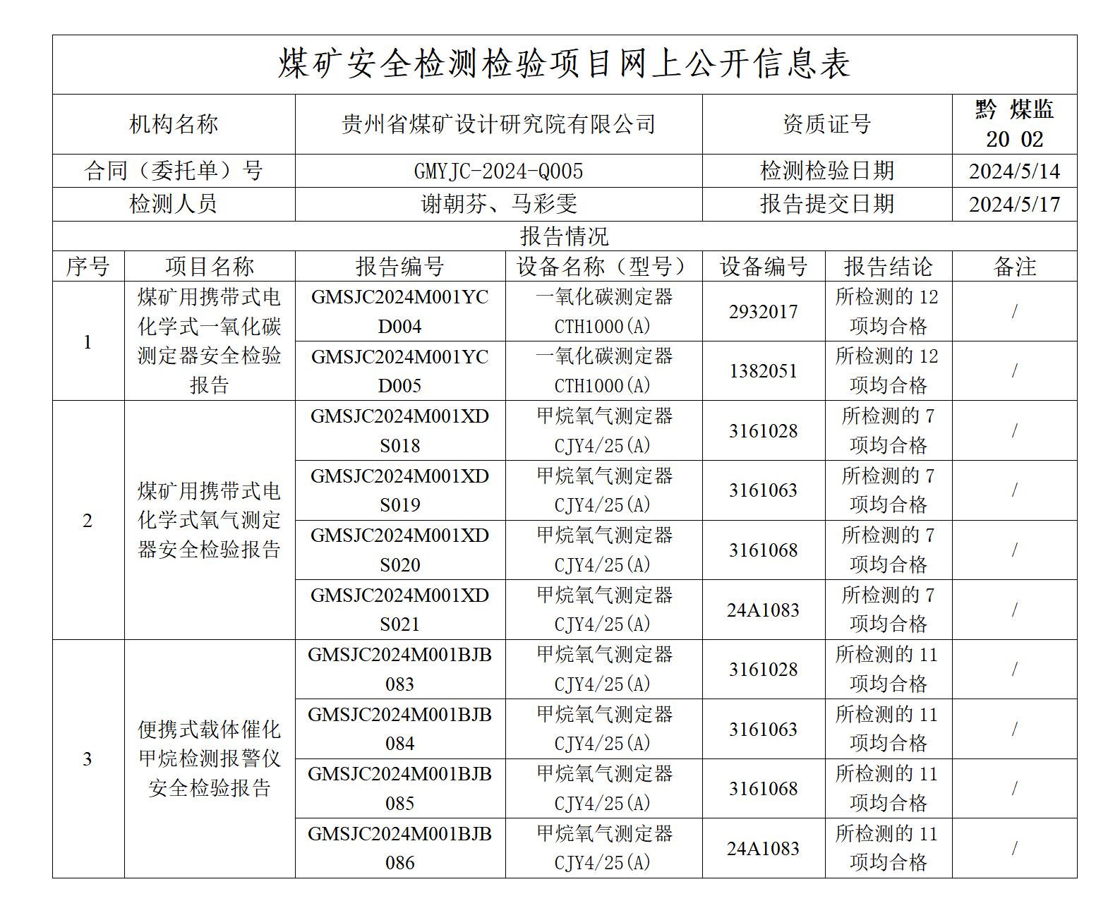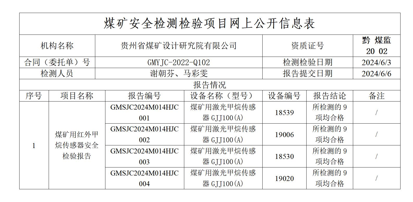 煤礦安全檢測檢驗項目網上公開信息表(2024.7.2)