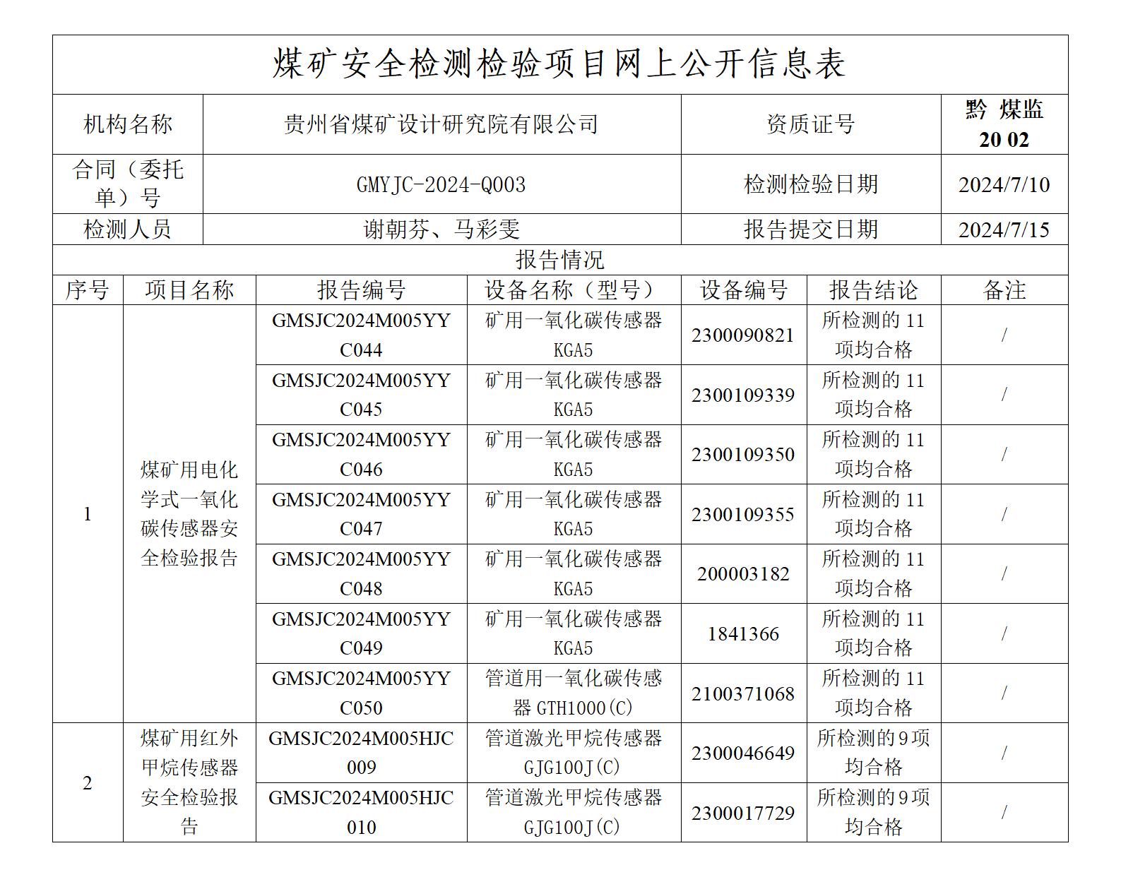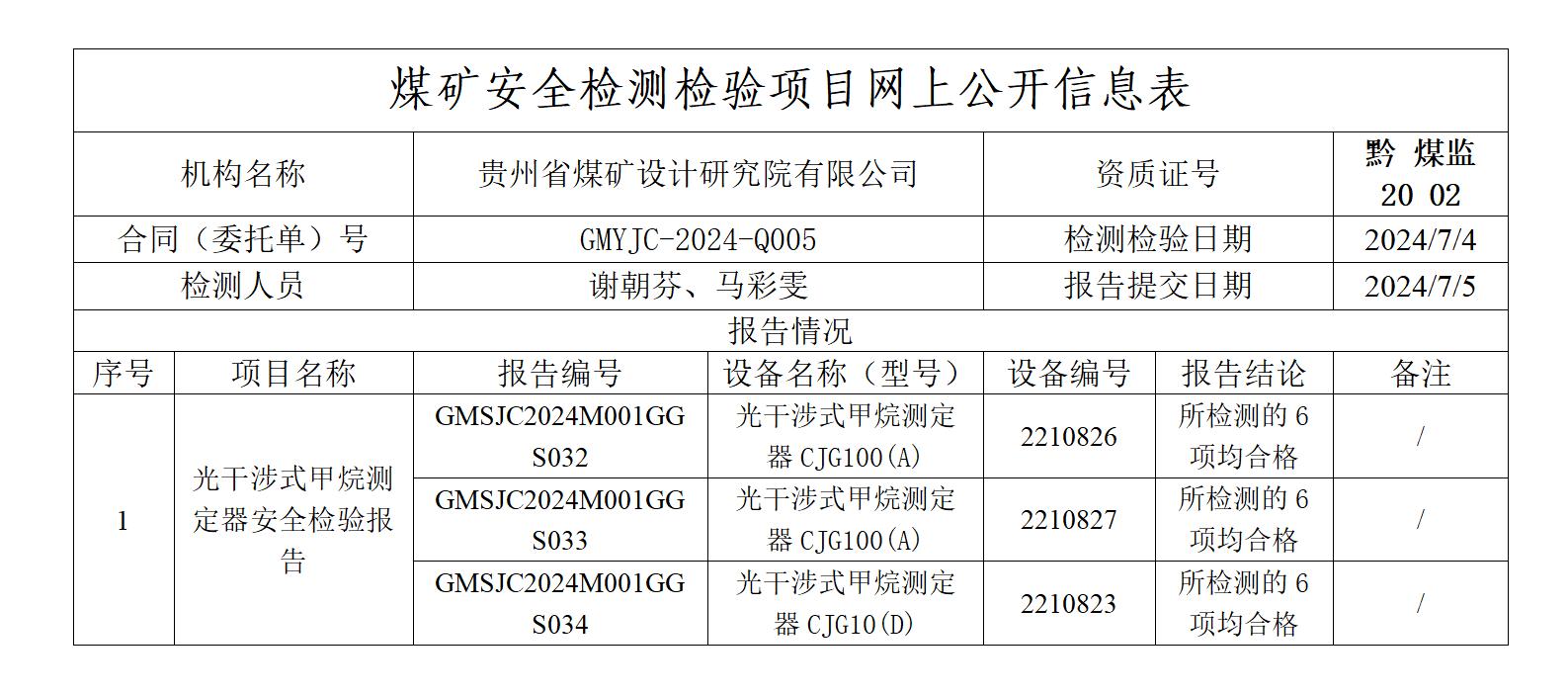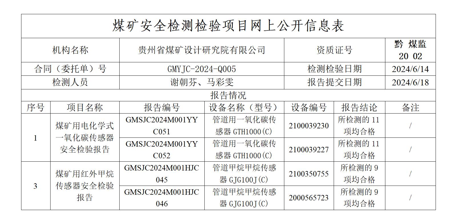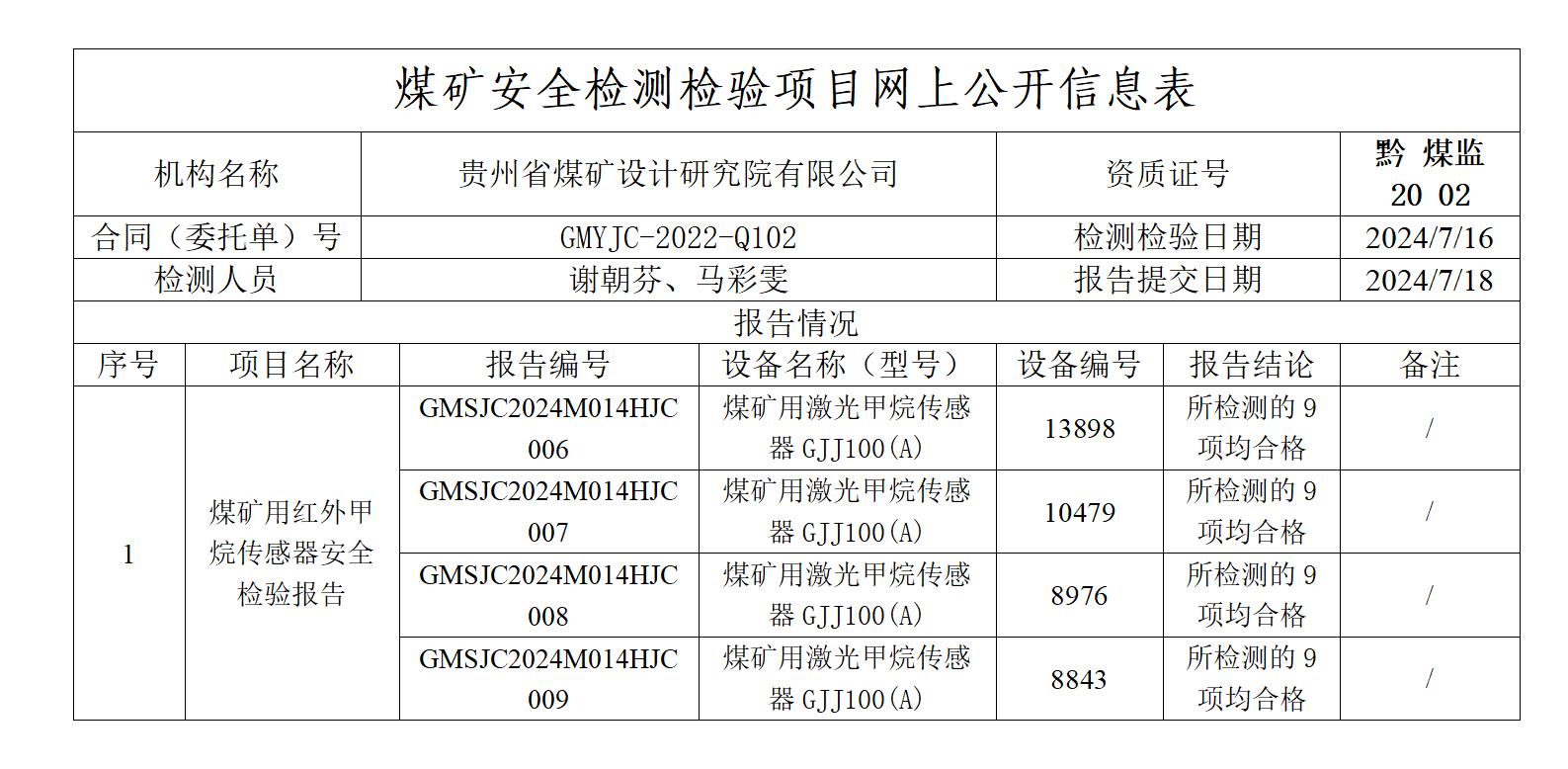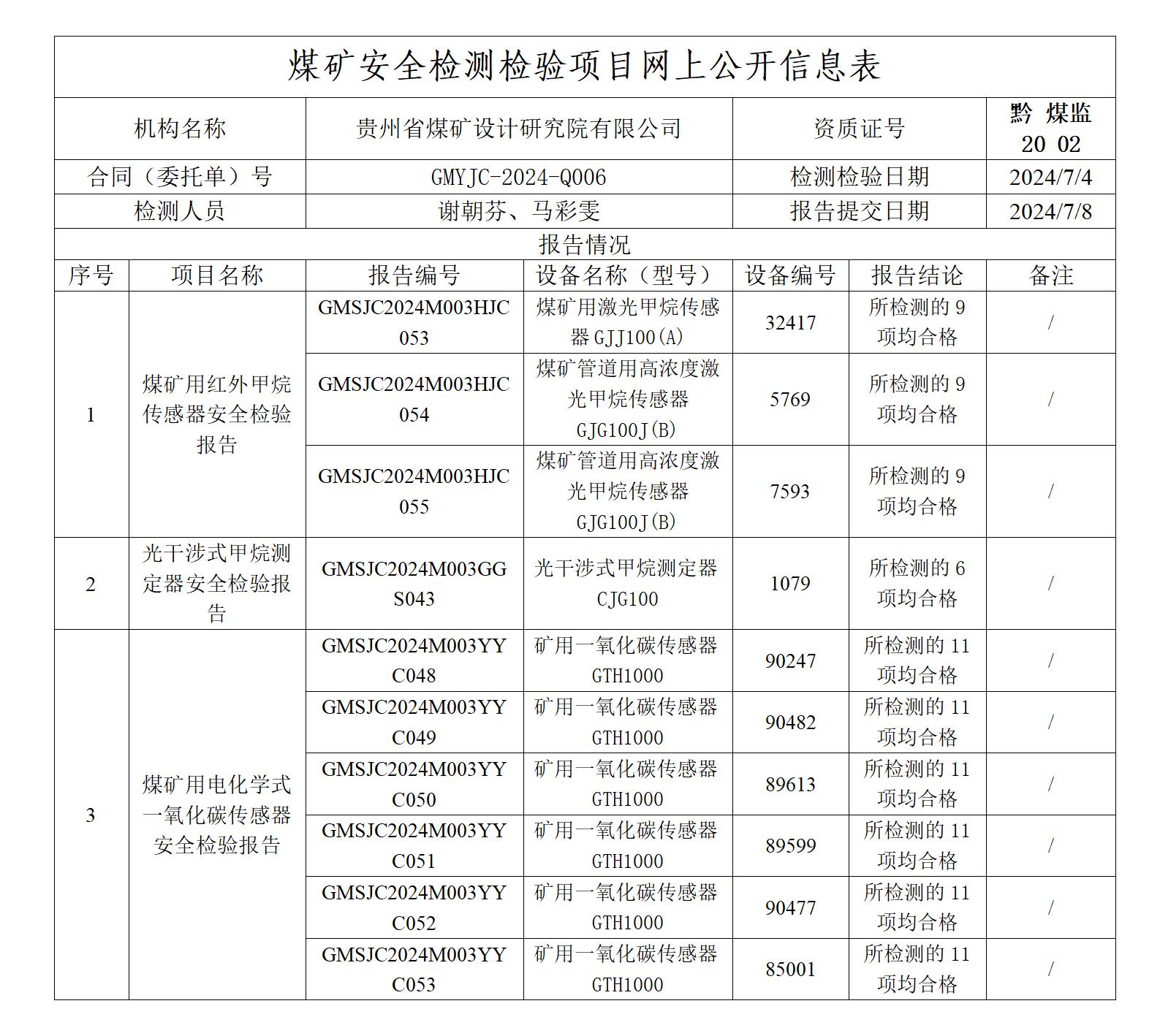 煤礦安全檢測檢驗項目網上公開信息表(2024.7.22)