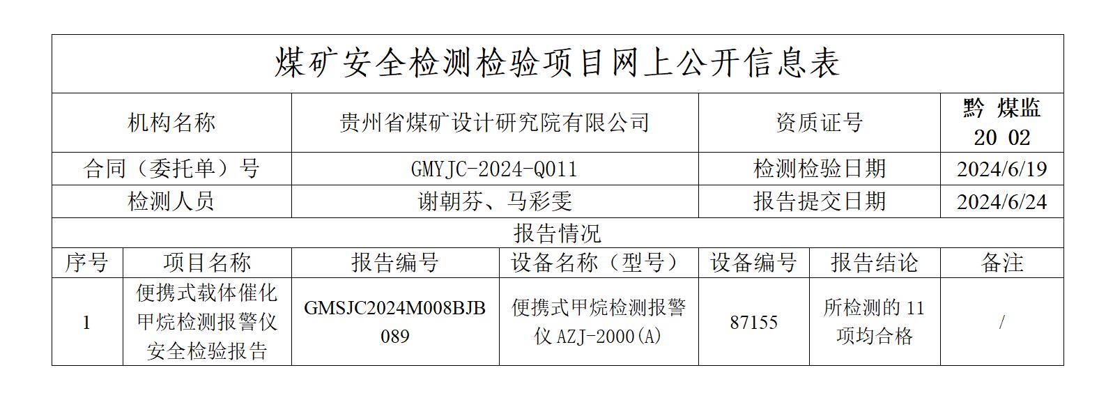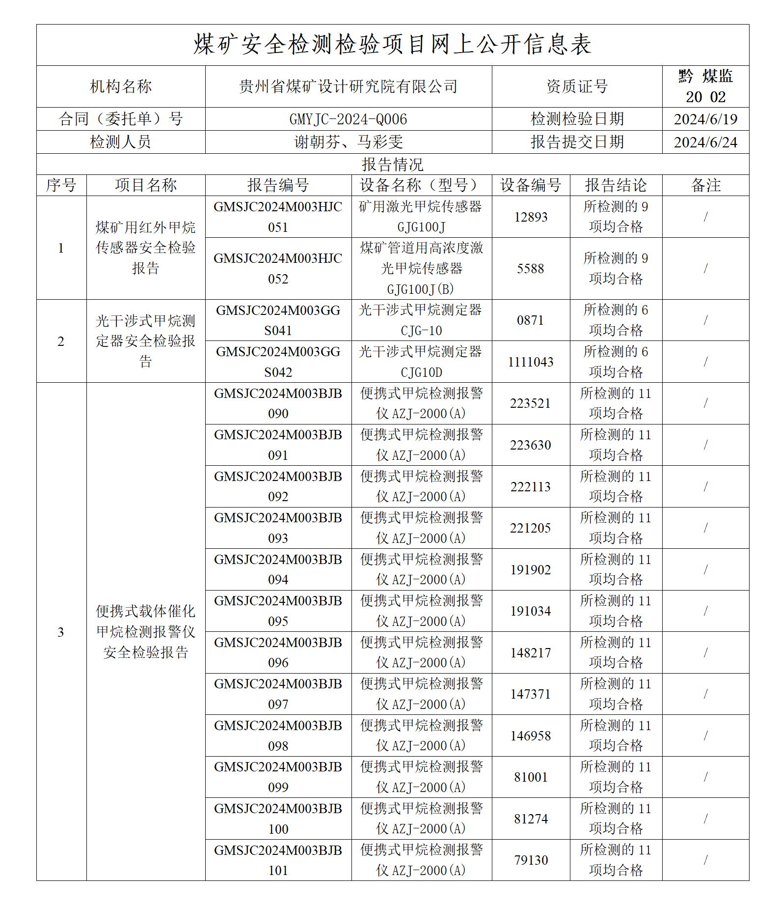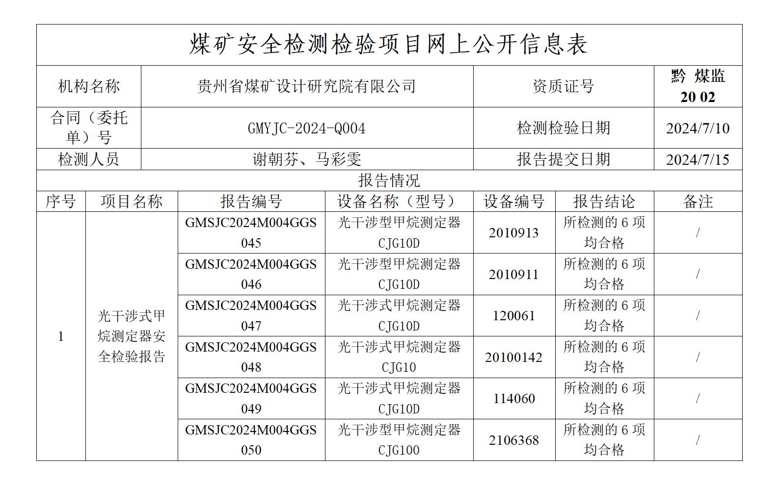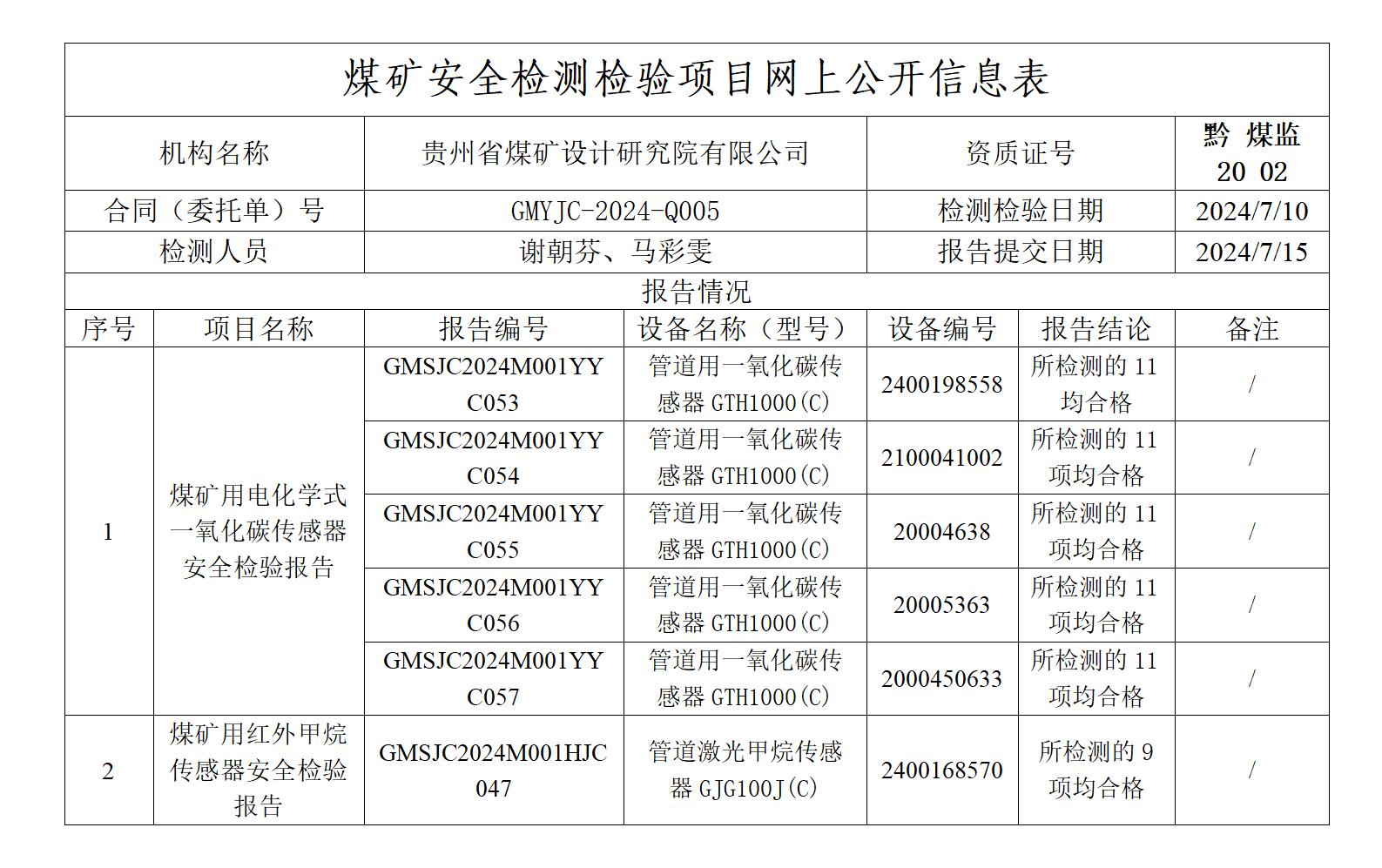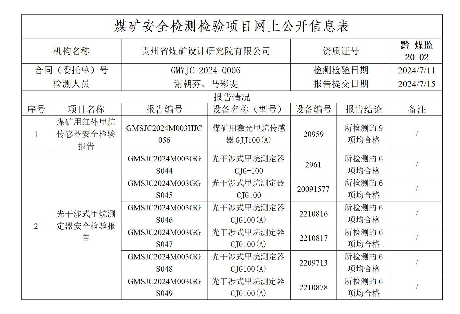 煤礦安全檢測檢驗項目網上公開信息表(2024.7.22)
