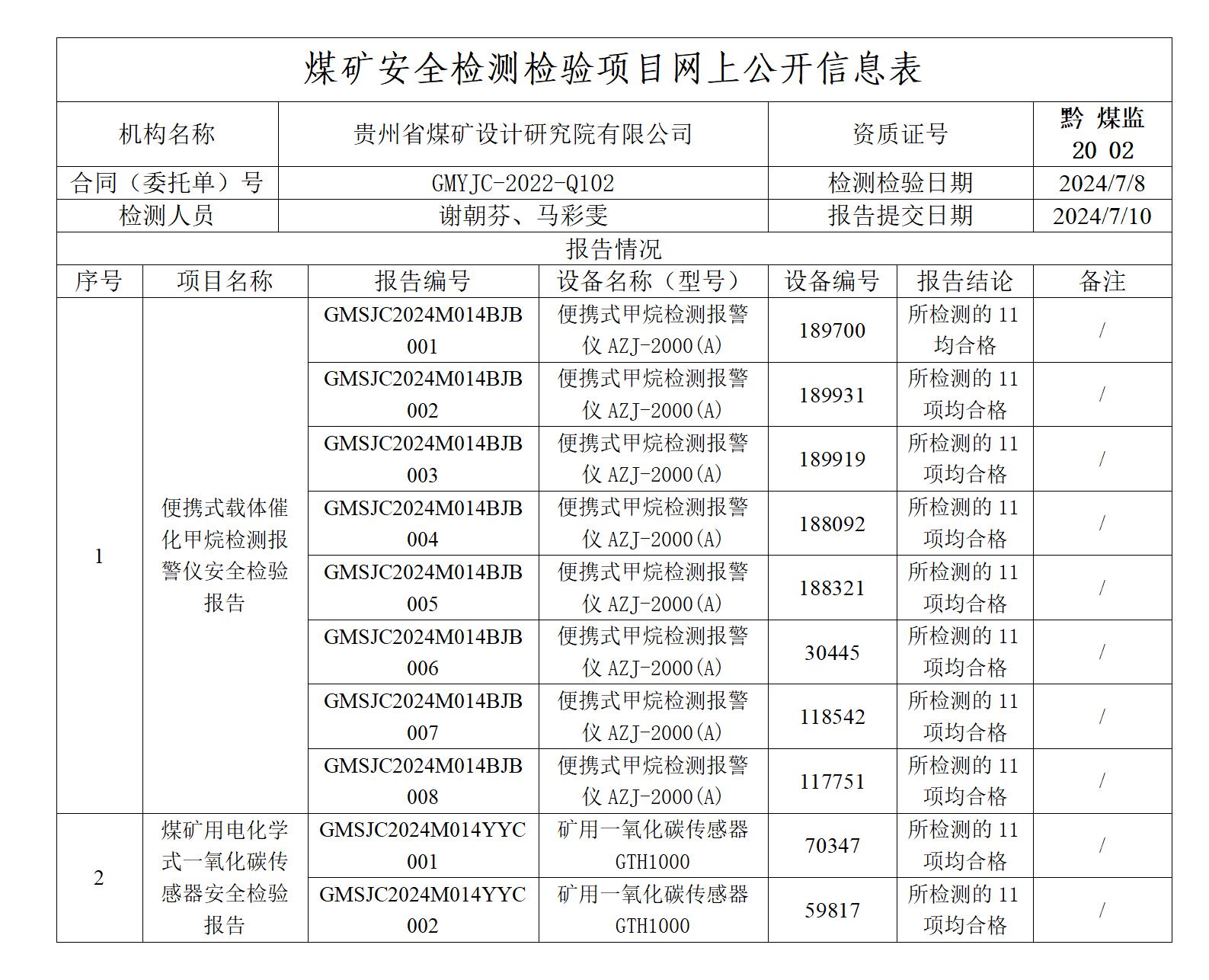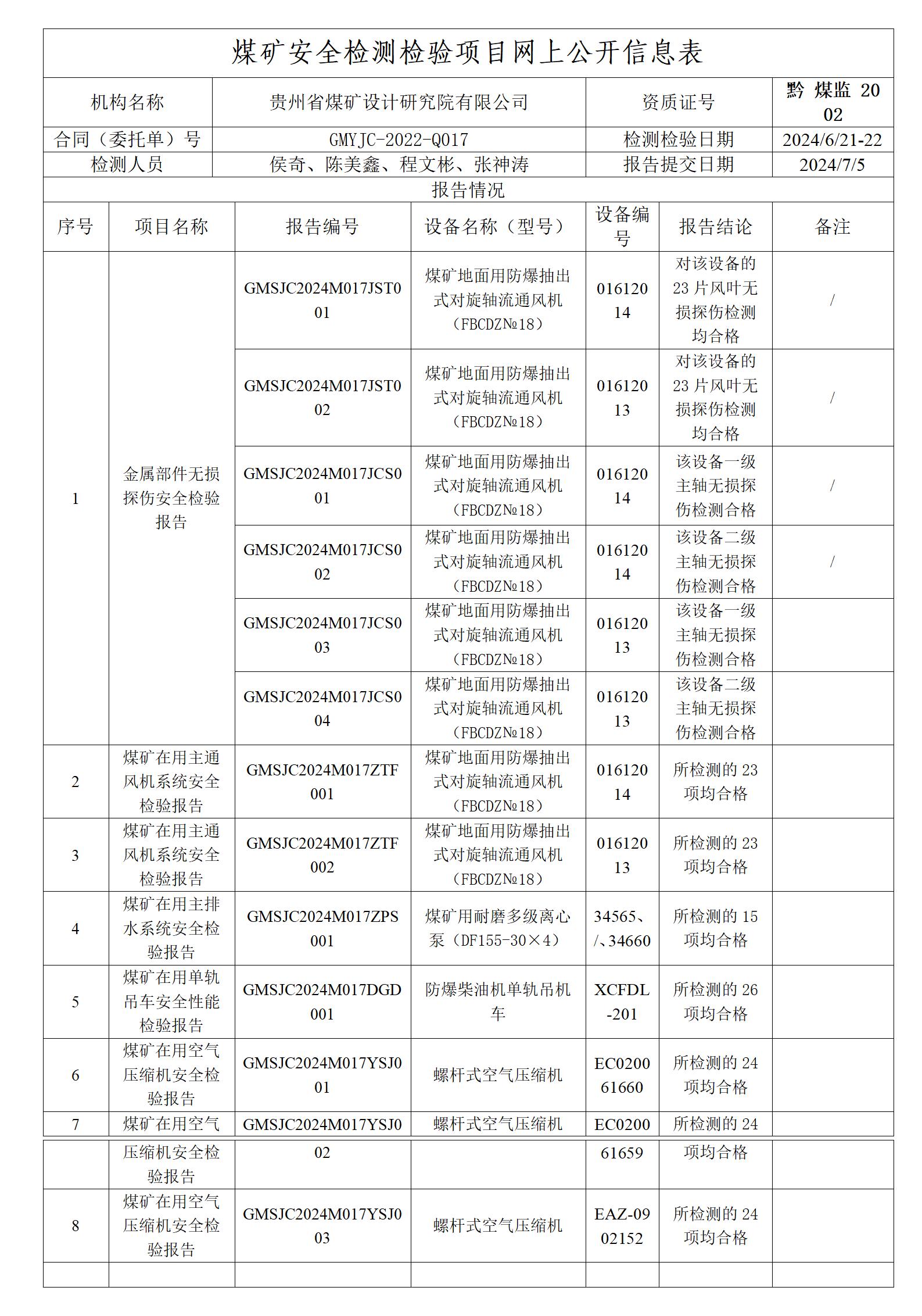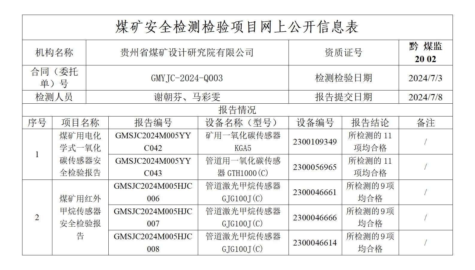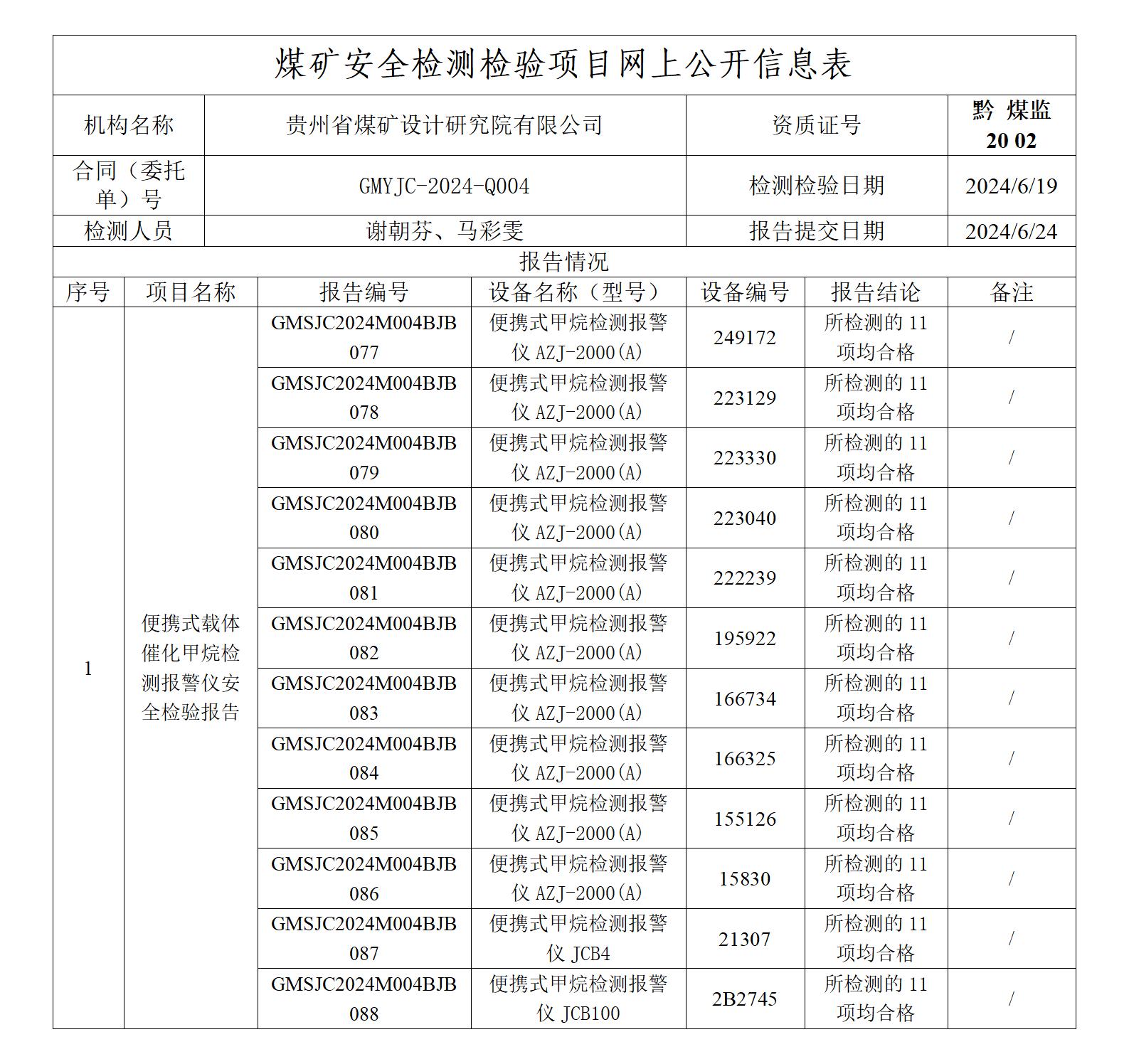 煤礦安全檢測檢驗項目網上公開信息表(2024.7.22)