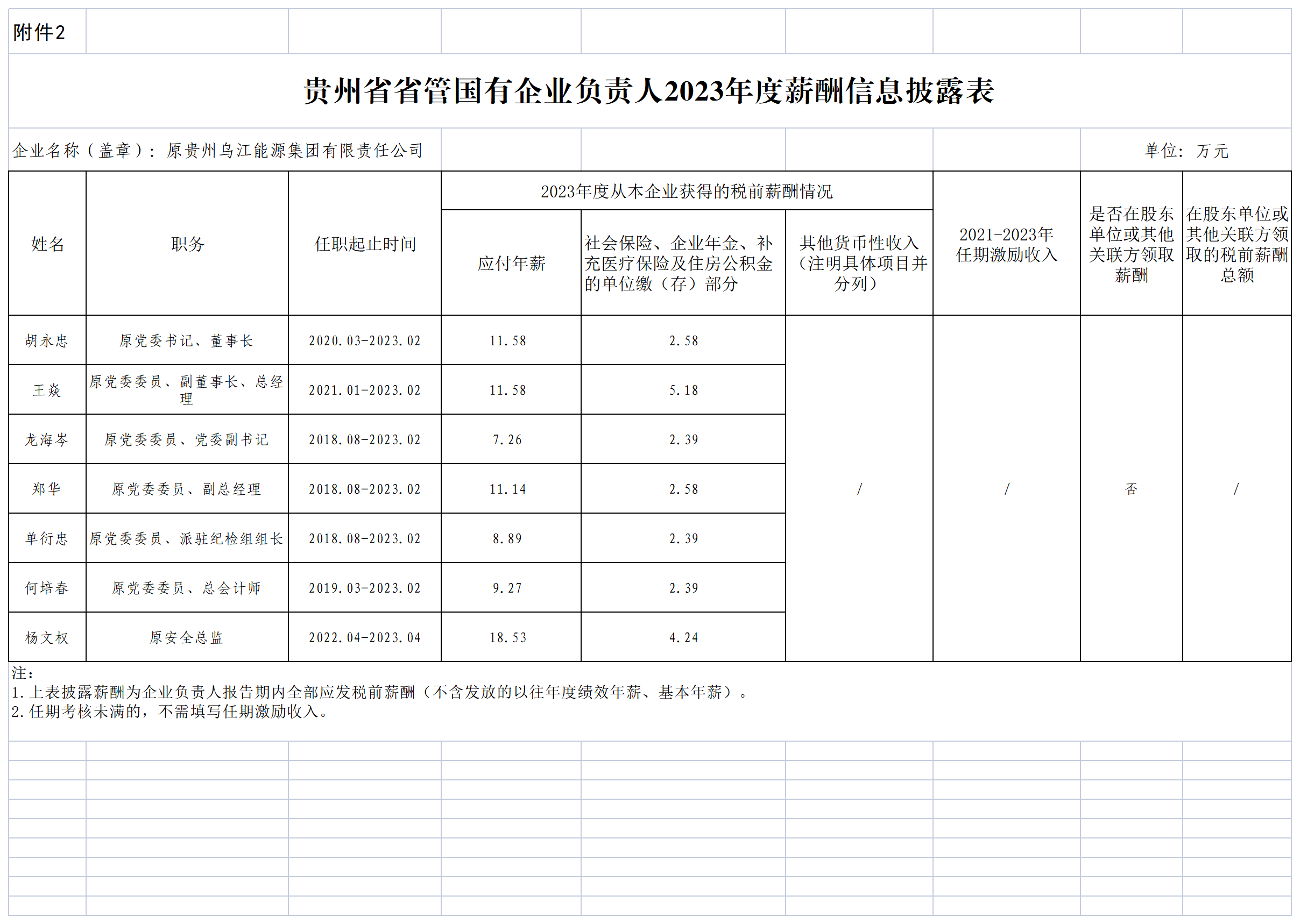 原烏江能源集團企業負責人2023年度薪酬信息披露表